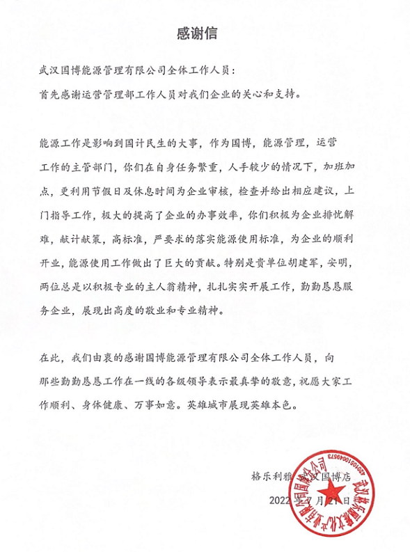 “以客為尊,用戶至上”,新城國博洲際項目星空會所“格樂利雅藝術(shù)中心”6月底正式對外營業(yè),藝術(shù)中心開業(yè)前,為提高藝術(shù)中心空調(diào)使用、空間用能效果,達(dá)到節(jié)能降耗的目的,國博能源公司技術(shù)負(fù)責(zé)人及技術(shù)骨干經(jīng)常到施工現(xiàn)場進(jìn)行技術(shù)指導(dǎo),免費為客戶提供技術(shù)咨詢服務(wù),藝術(shù)中心順利營業(yè)后,區(qū)域內(nèi)溫控及節(jié)能降耗效果明顯,客戶送來感謝信對國博能源公司優(yōu)質(zhì)、細(xì)致的服務(wù)表示肯定和贊揚。